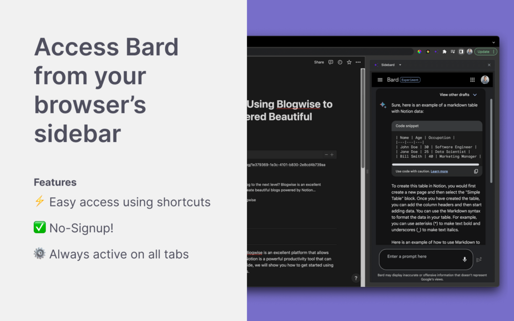 With this extension, you can easily access Bard from the browser's sidebar without having to open a new tab. This makes it quick and easy to get help with whatever you're working on.